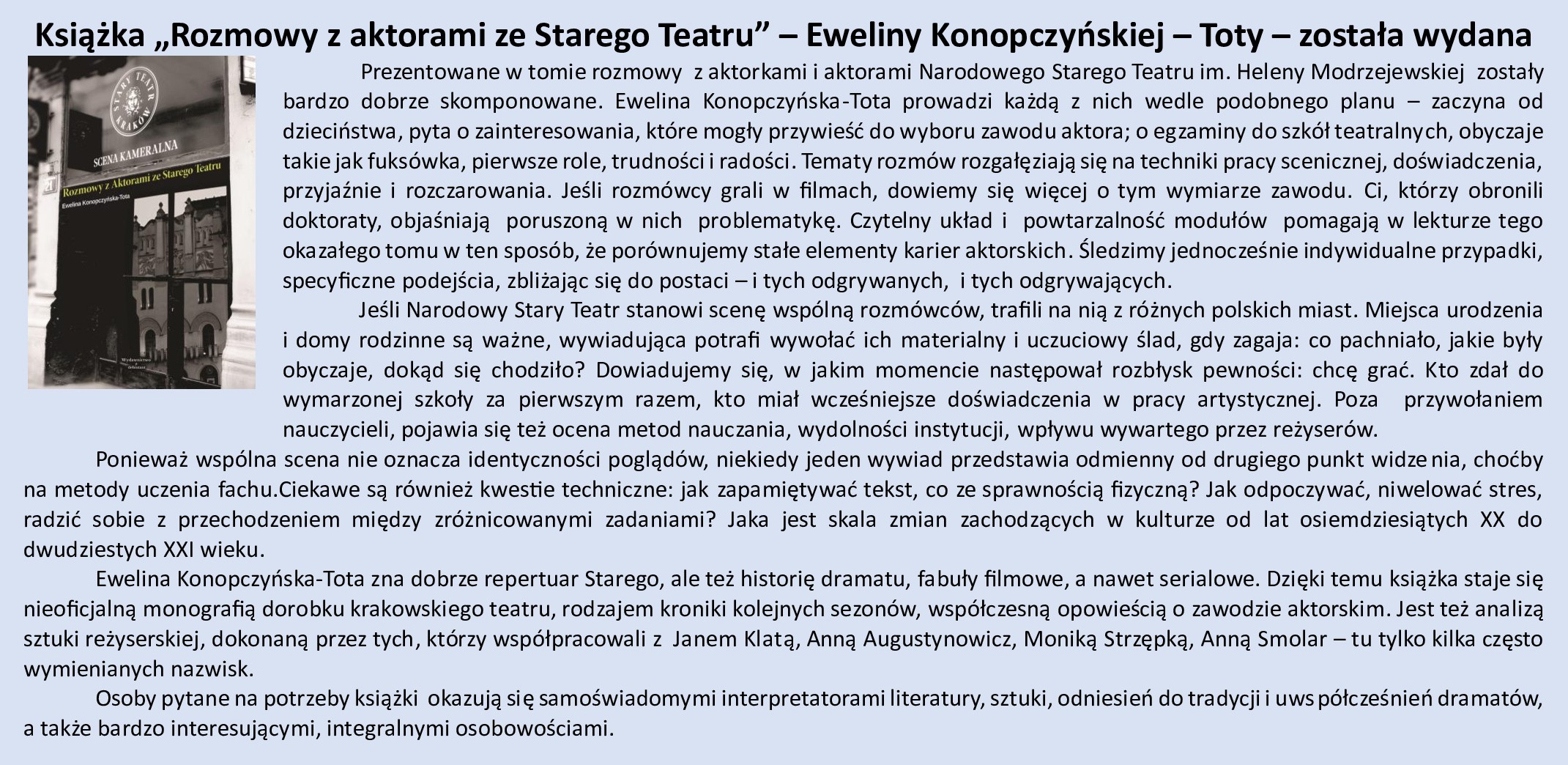 Książka „Rozmowy z aktorami ze Starego Teatru” – Eweliny Konopczyńskiej – Toty – została wydana